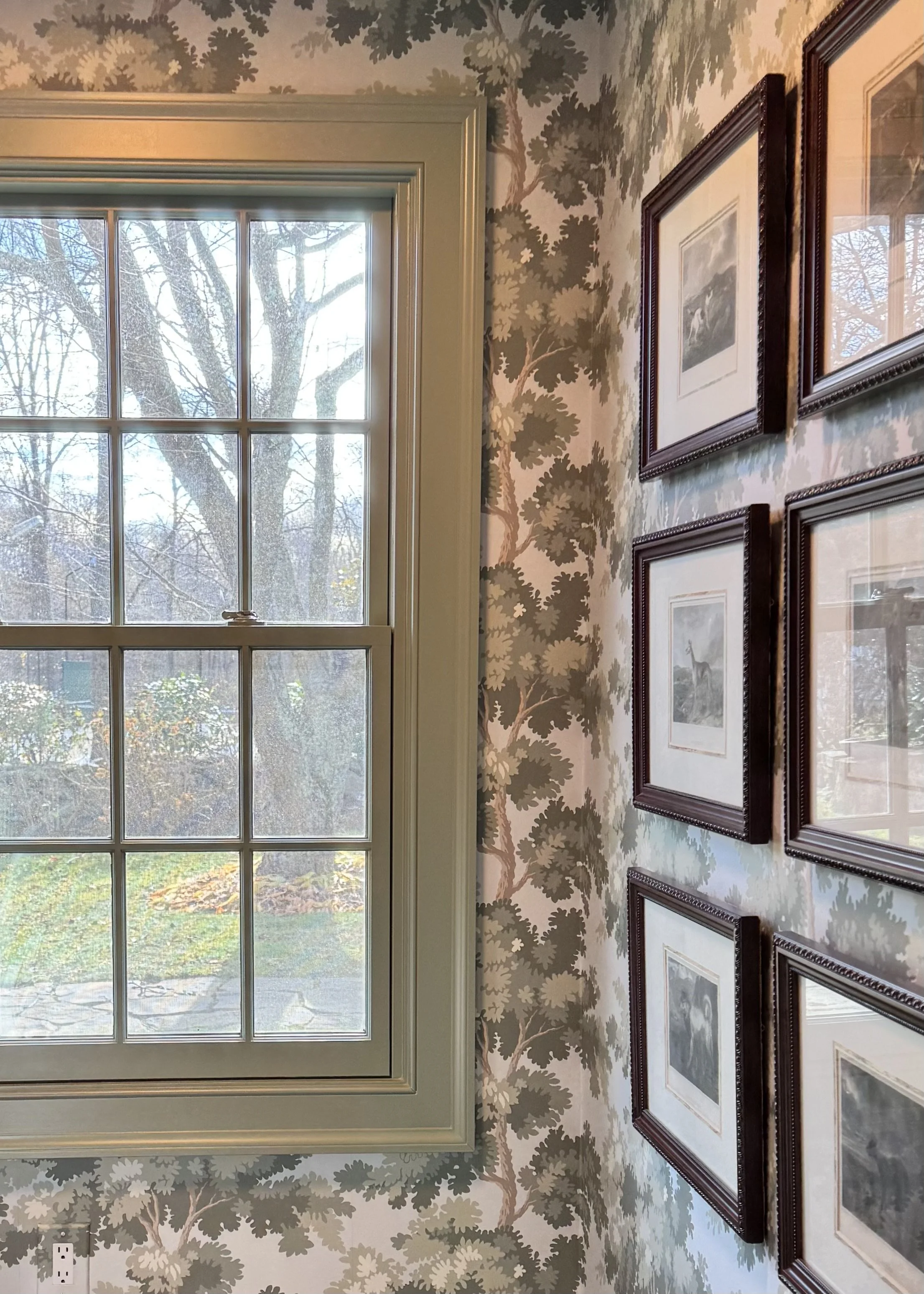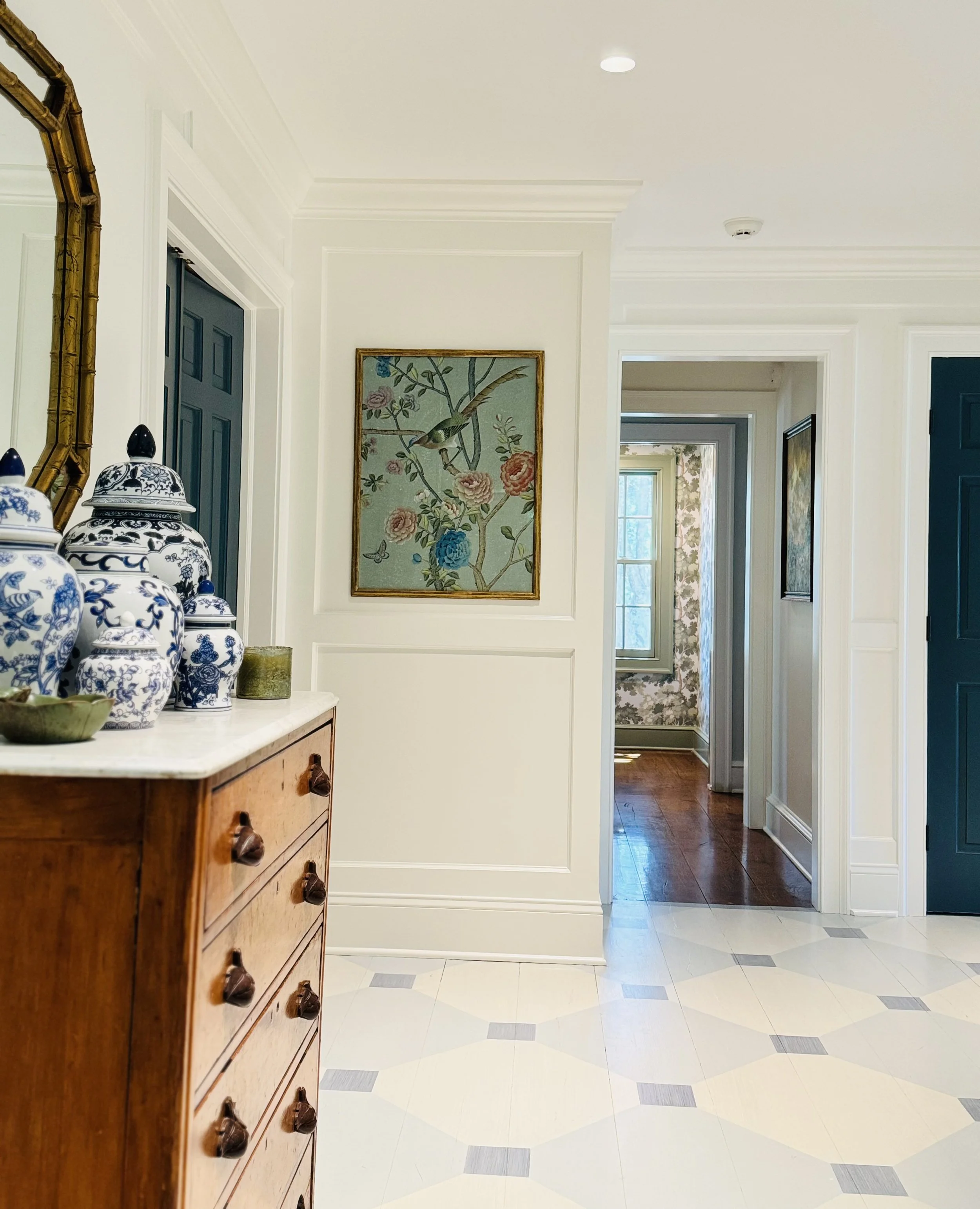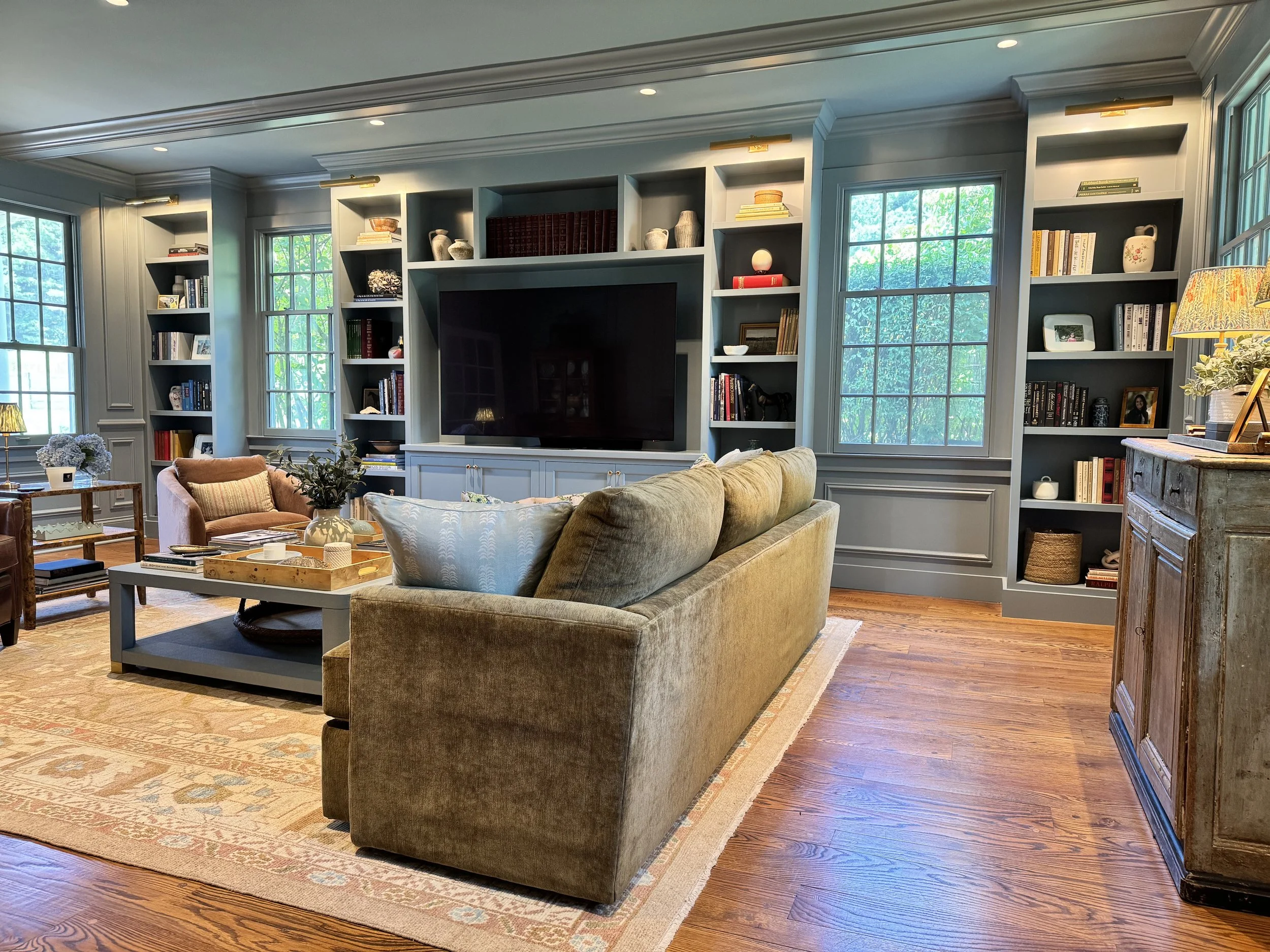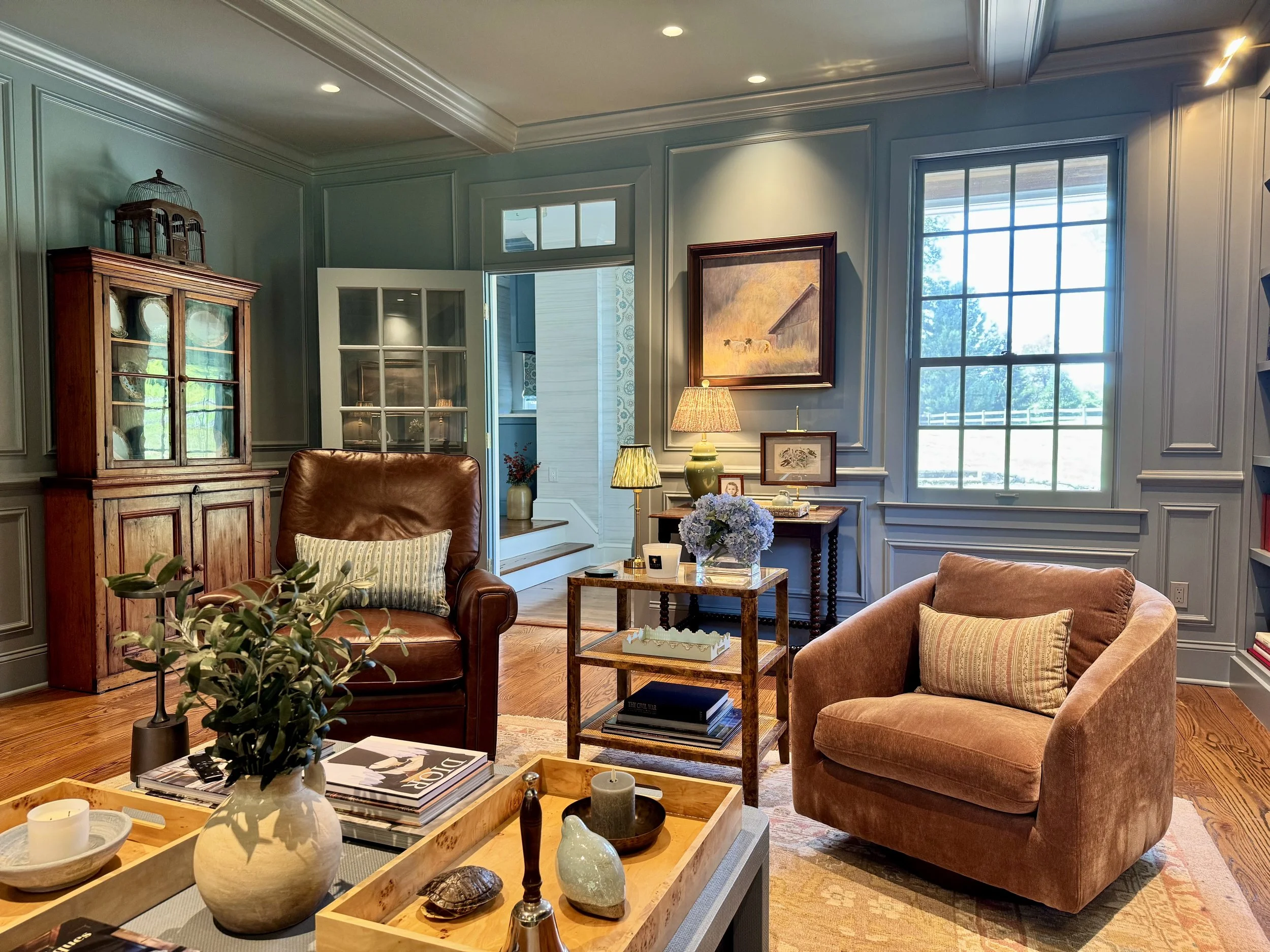 Richly patterned fabrics, antique furnishings, and an earthy palette of sage, slate, and dusty rose set the tone throughout. Built-in bookshelves, botanical prints, and heirloom ceramics lend each room the feeling of a collection assembled over generations. Garden views were treated as an extension of the interior, with palettes chosen to echo the seasonal blooms and hedgerow greens beyond the windows.
